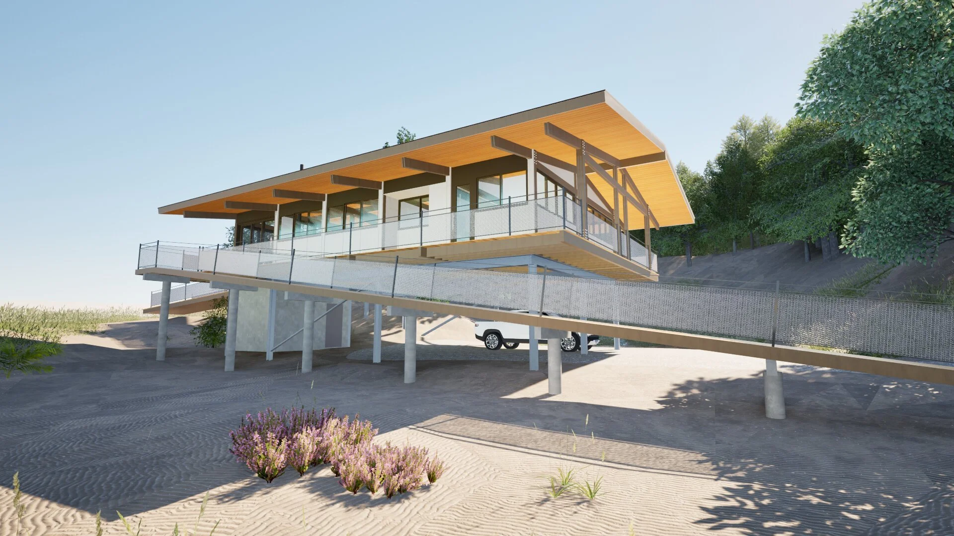 Situated in the critical dune area of Lake Michigan, this new cottage will be elevated above the dune to minimize disturbance with the natural landscape.