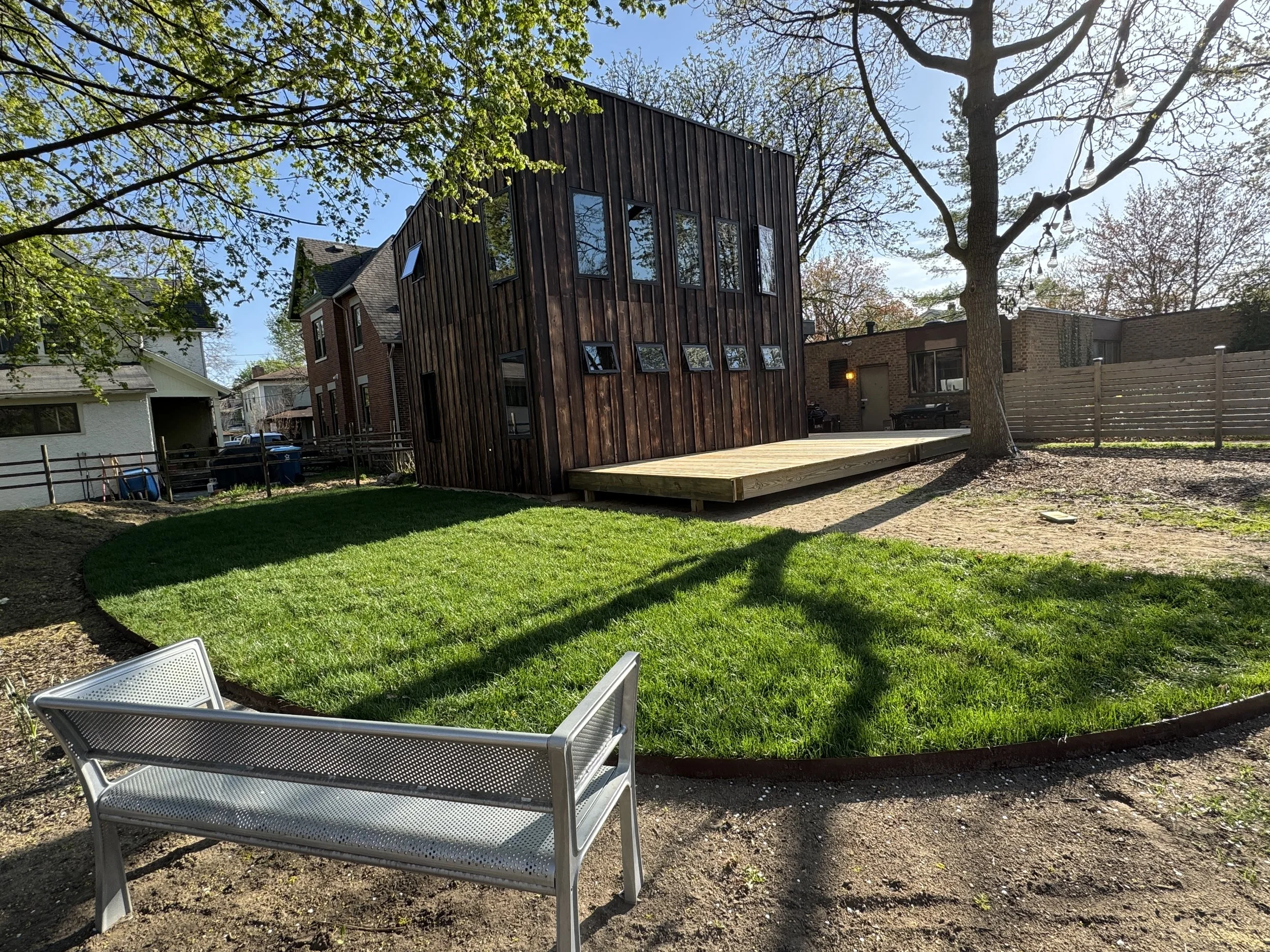This prototype tiny home is currently under construction and will serve as flex space for the newly renovated home to the west of the tiny house that was previously utilized for a commercial law office.